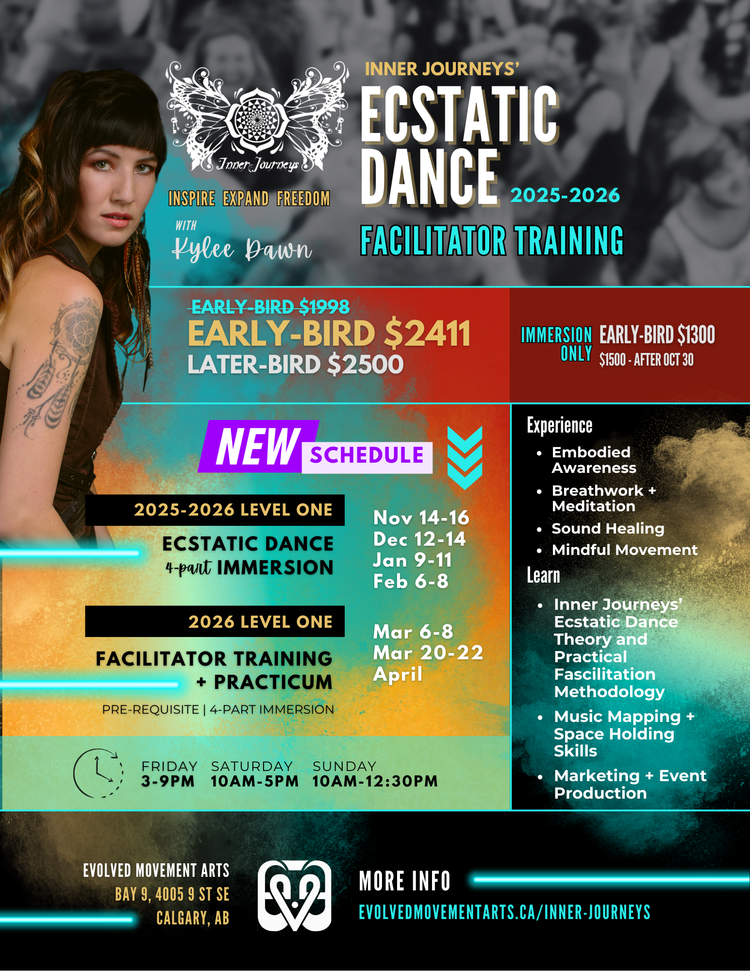 Four x weekend-long deep dives into Ecstatic Dance and self-exploration. For those interested in becoming a certified “Inner Journeys’ Level One Ecstatic Dance Facilitator” this 4-module Immersion is included with Kylee’s 2025-2026 Facilitator Training and Practicum.